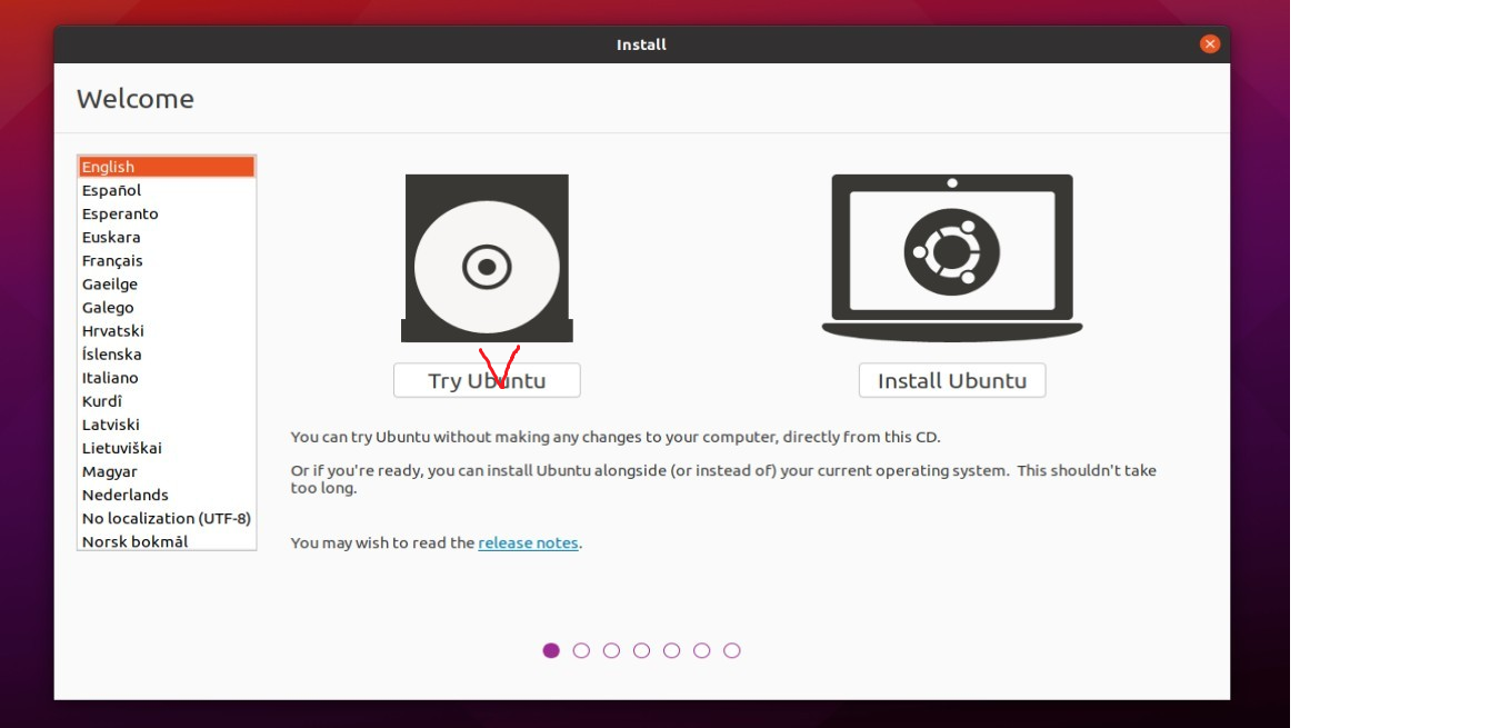 2.우분투 live-mode(밑에 화면)으로 연결되면 try ubuntu 클릭.