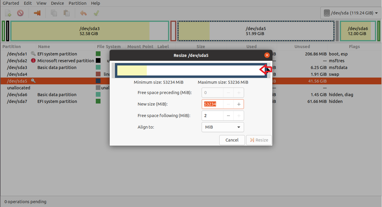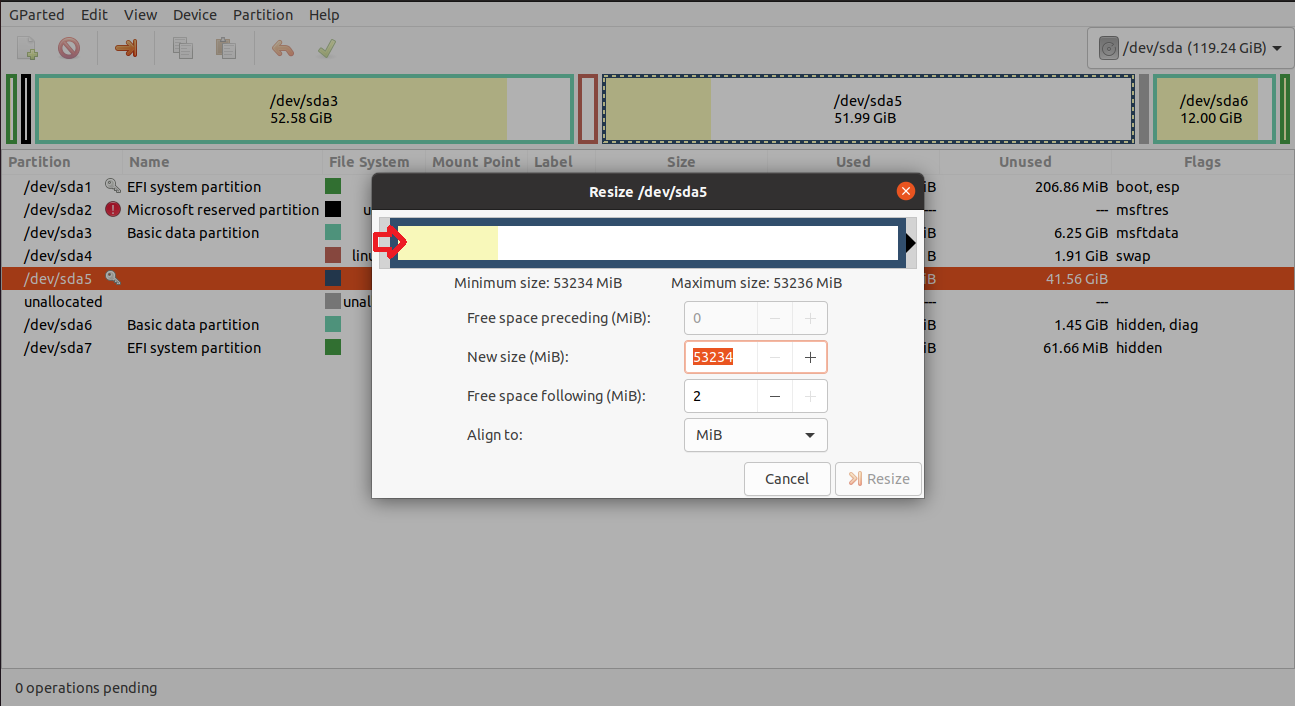 4-2.파티션을 아래쪽으로 재분배 하고 싶은경우(지금 나의 예시로 보면 sda5의 일정용량을 sda6으로 재분배하고 싶은경우)